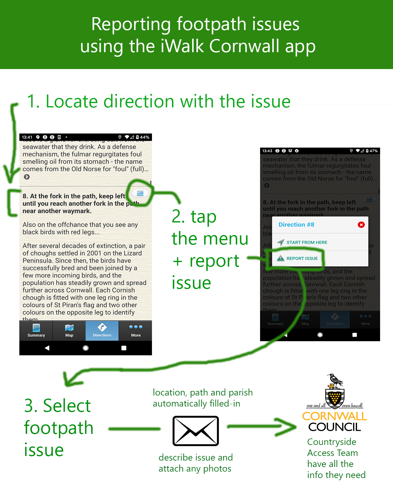The app knows the footpath number and parish details for each direction, so by triggering a report from a direction number where the problem has been spotted, it can fill all this information in automatically in an email for the Cornwall Council Countryside Access Team (who maintain the footpaths).